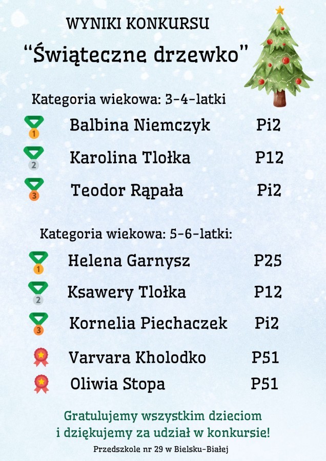 Serdecznie dziękujemy wszystkim przedszkolakom za udział w V Międzyprzedszkolnym Konkursie „Świąteczne drzewko”. W wydarzeniu wzięło udział 23 dzieci, które wykazały się ogromną kreatywnością i pomysłowością. Wszystkie świąteczne drzewka nas zachwyciły.