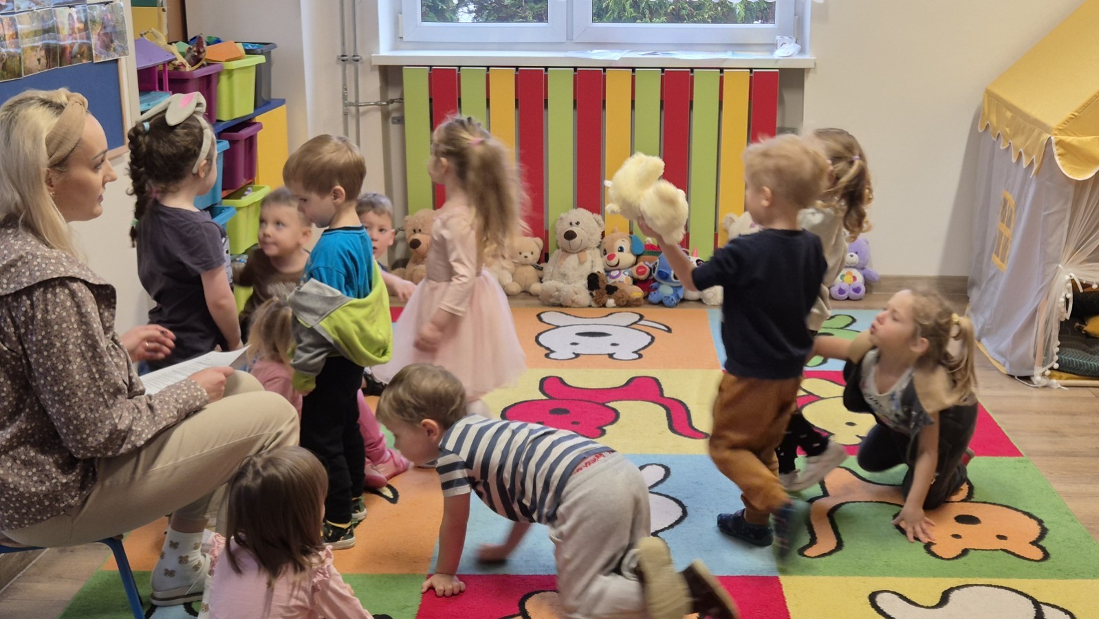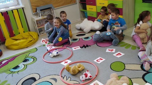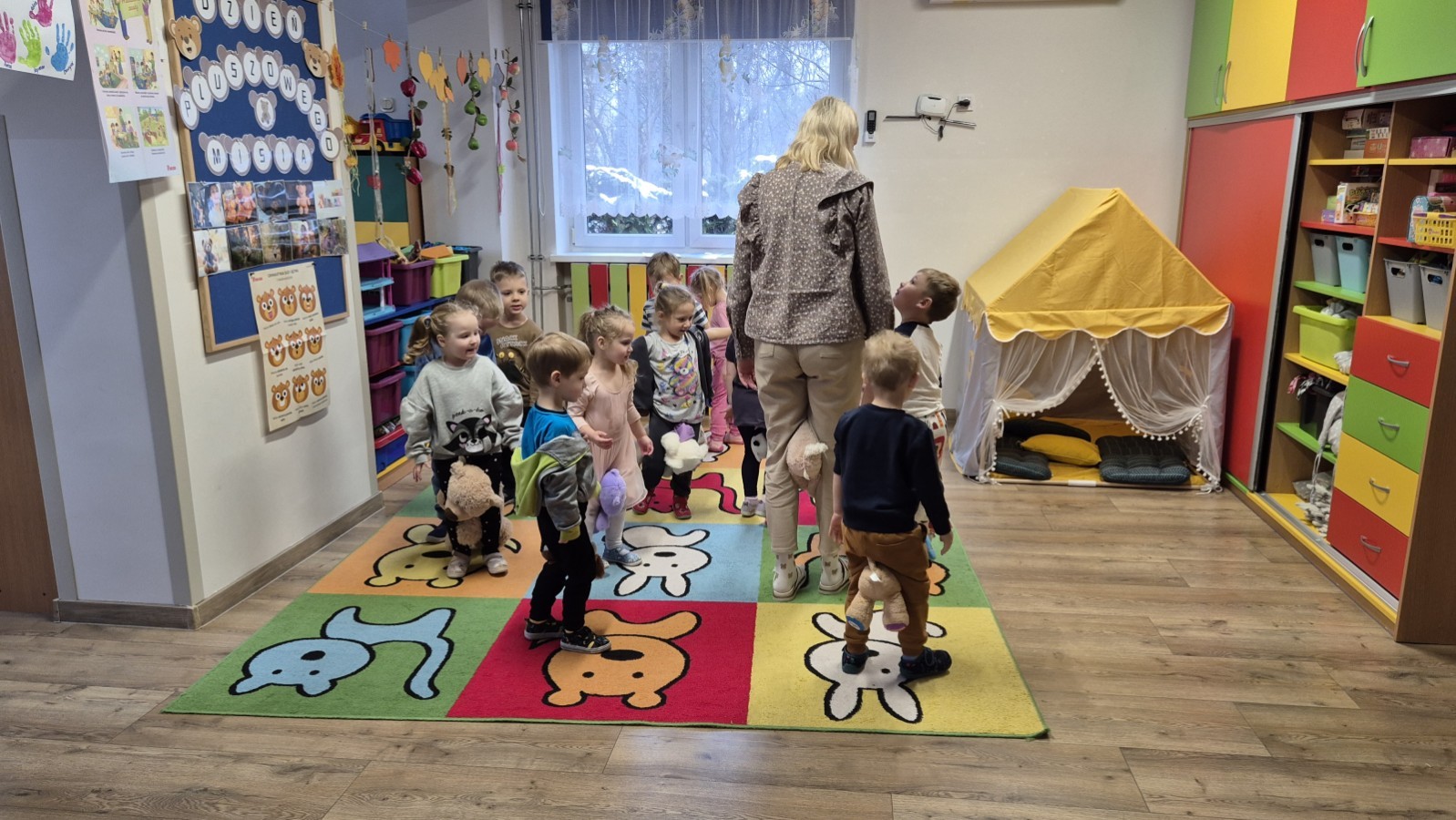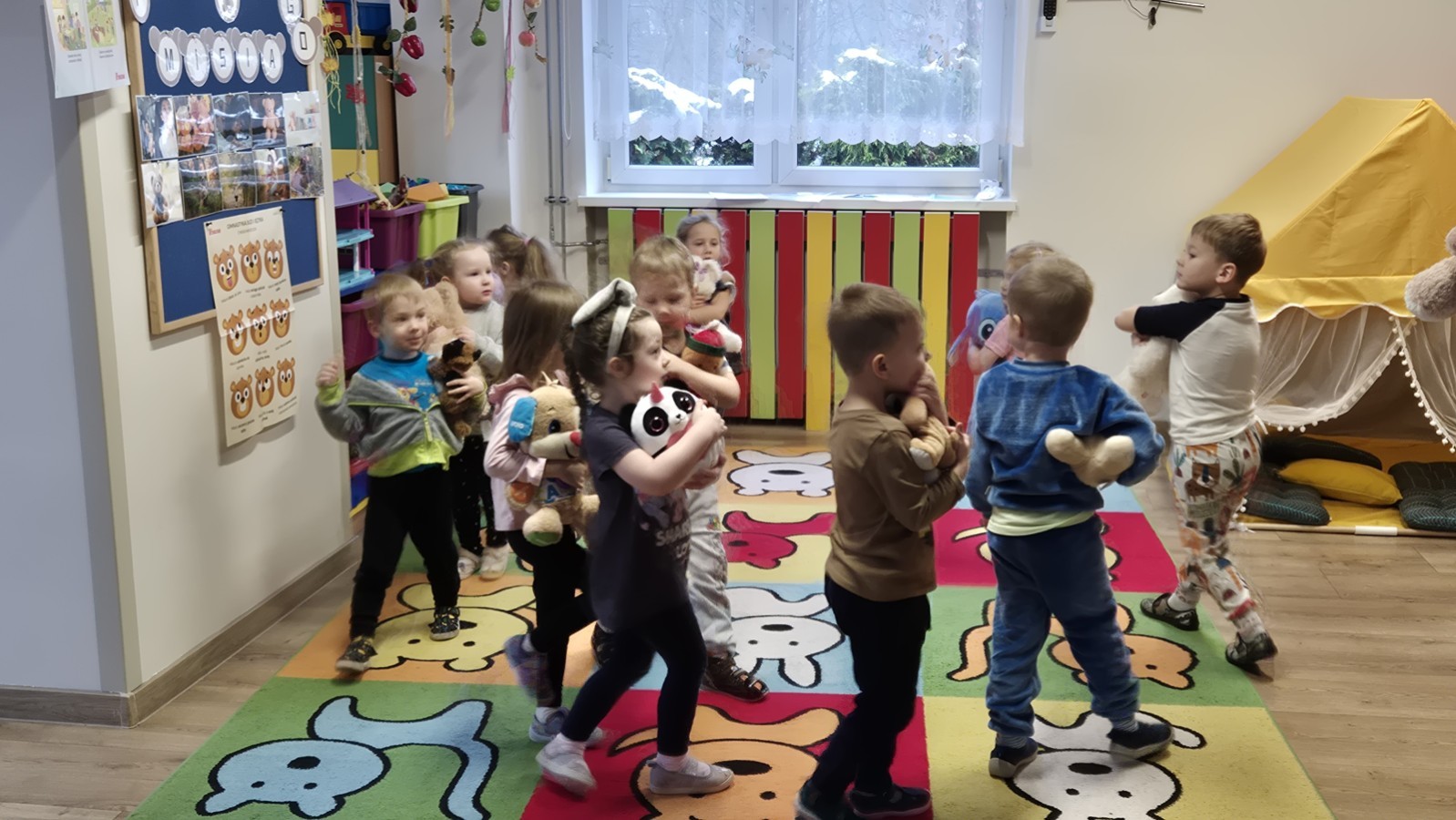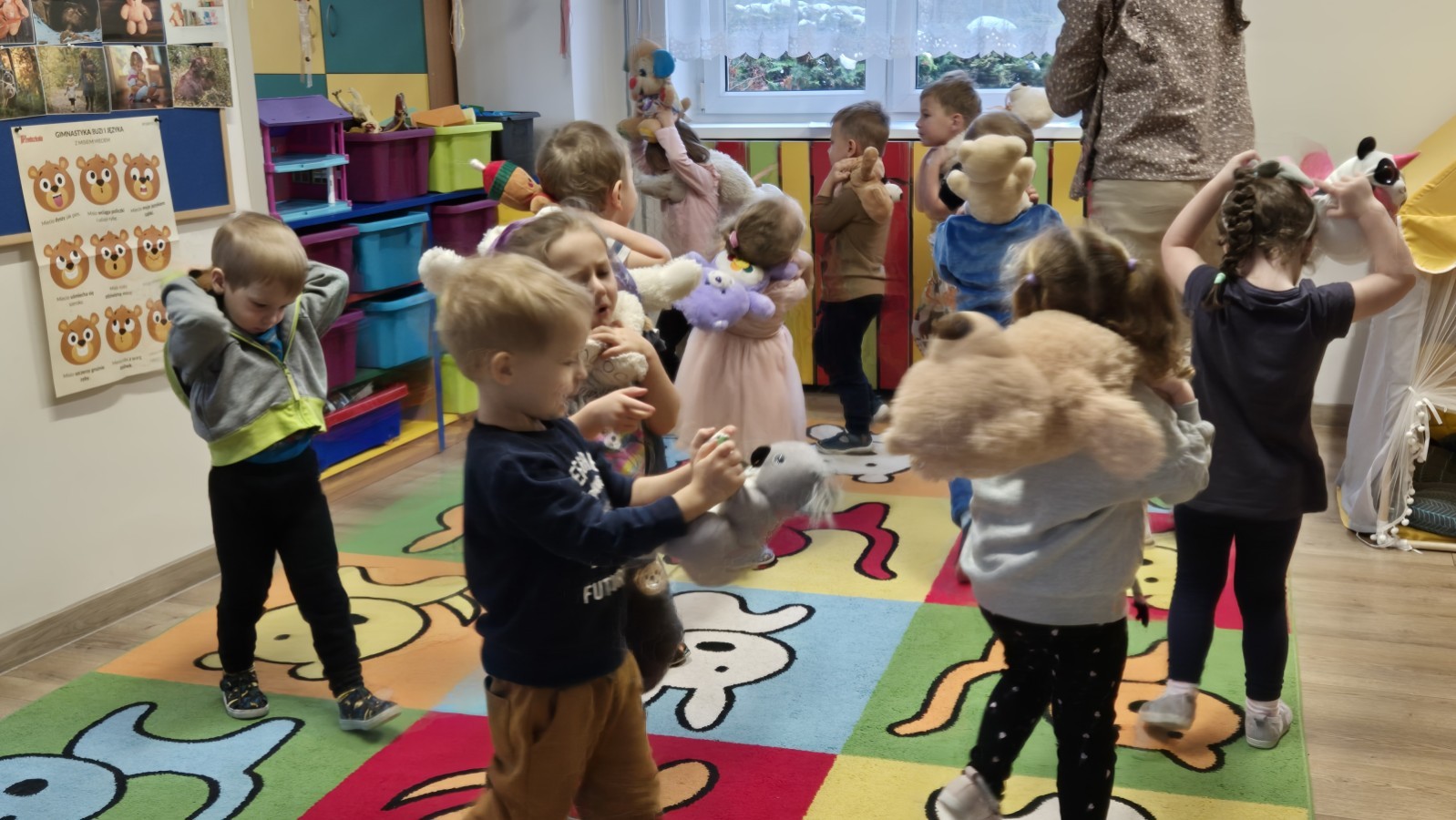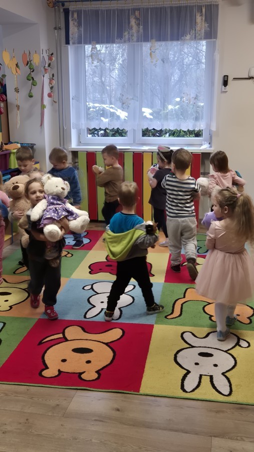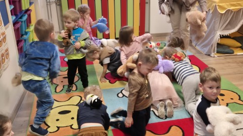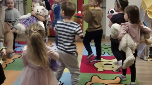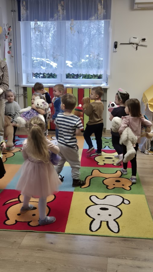 Dzieci z radością opowiadały o swoich ukochanych pluszakach, brały udział w wesołych zabawach ruchowych i zagadkach związanych z misiami. Nie zabrakło wspólnych tańców, zdjęć oraz misiowych aktywności plastycznych.
