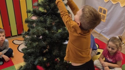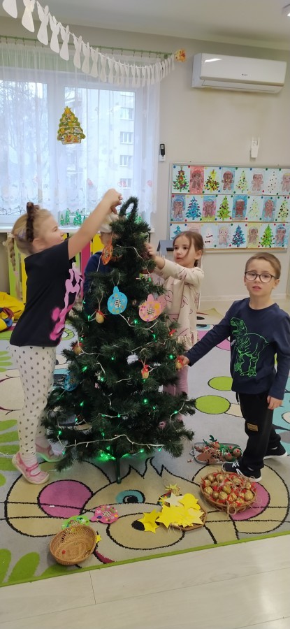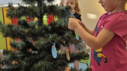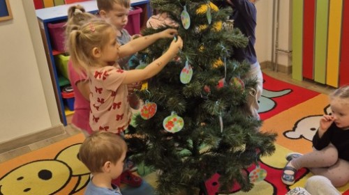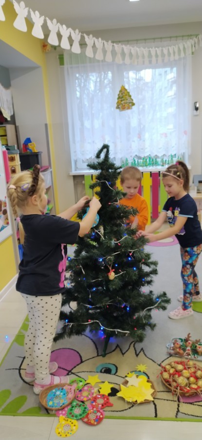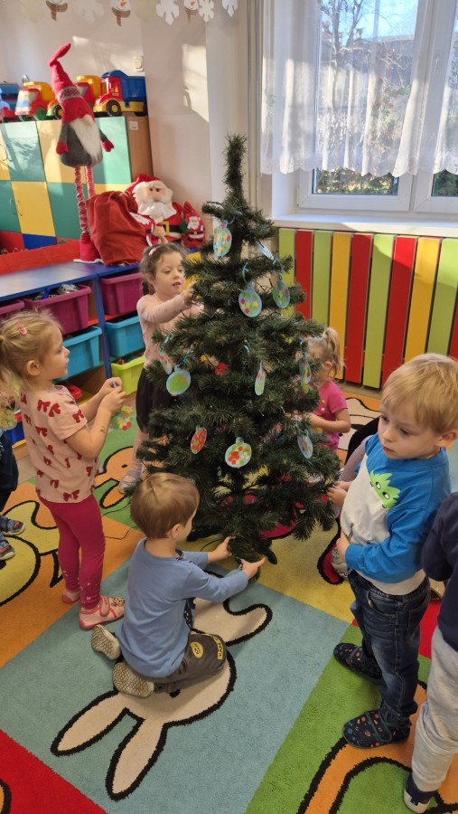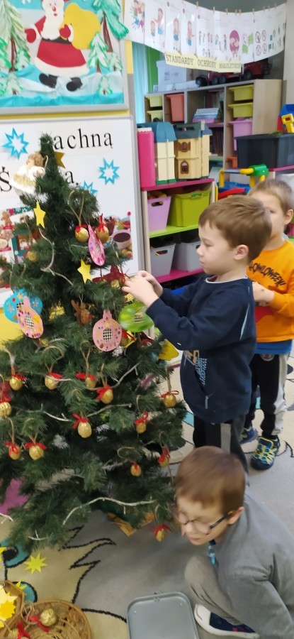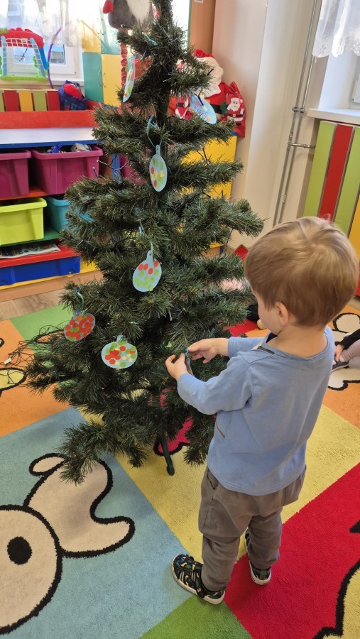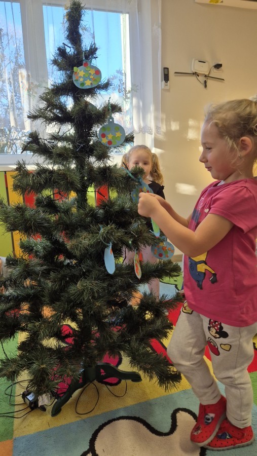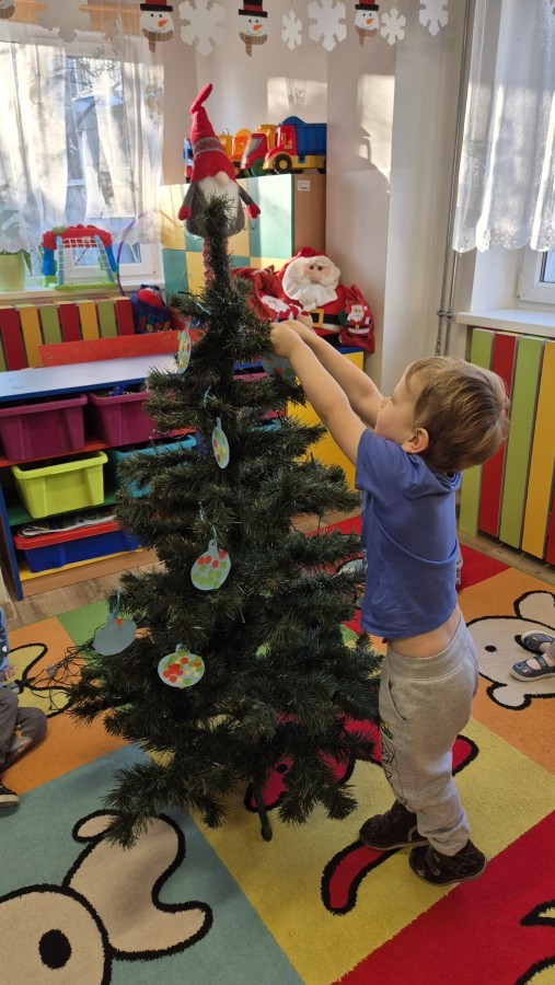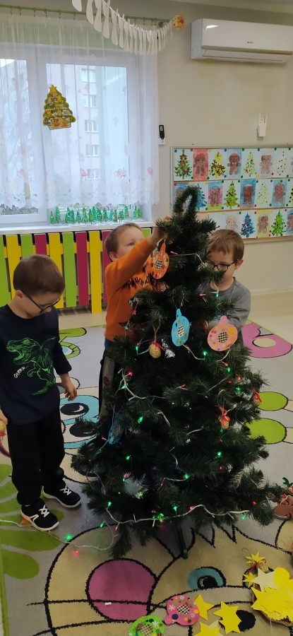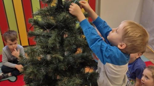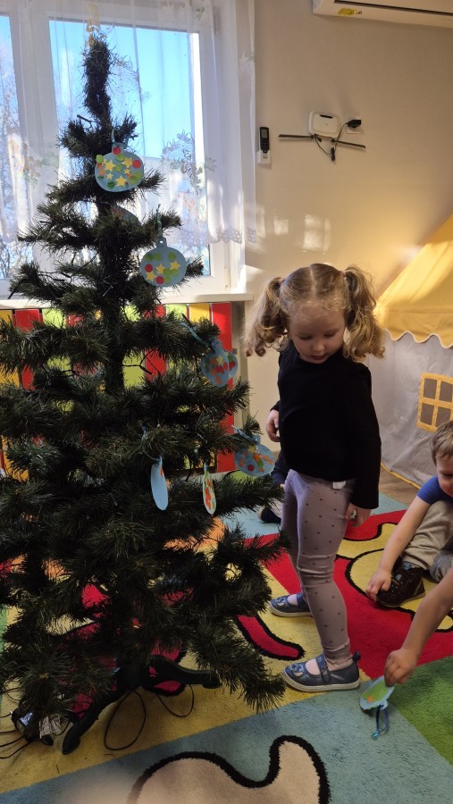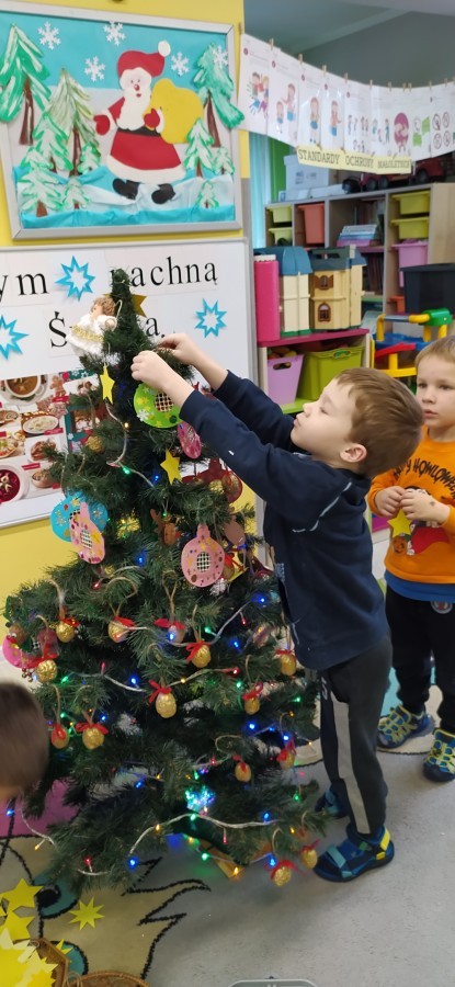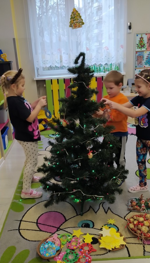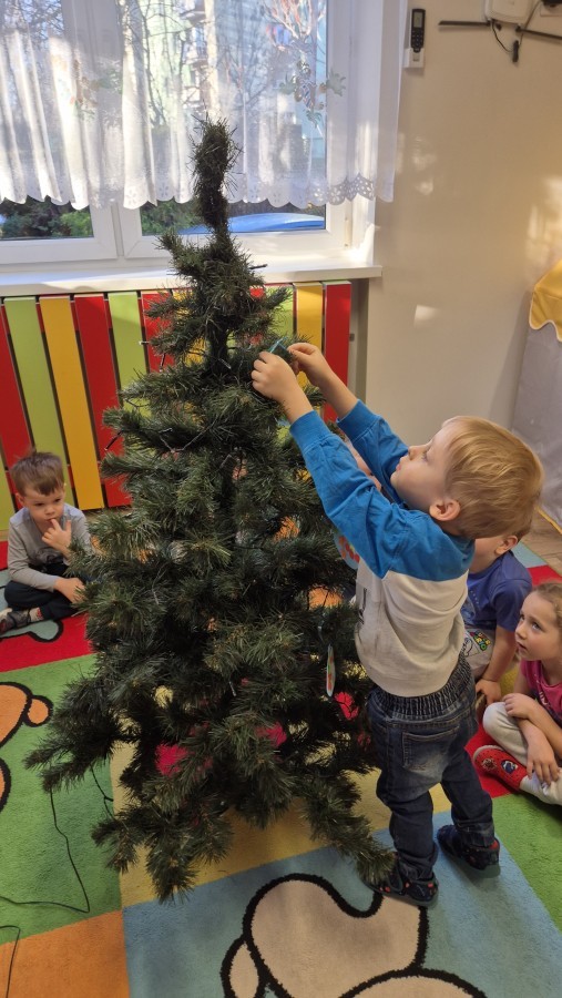 Zaczęliśmy od tego, co dzieci lubią najbardziej - strojenie choinek. Z wielkim zaangażowanie przedszkolaki zawieszały kolorowe bombki wykonane własnoręcznie. Obie choinki pięknie się prezentują w salach.