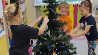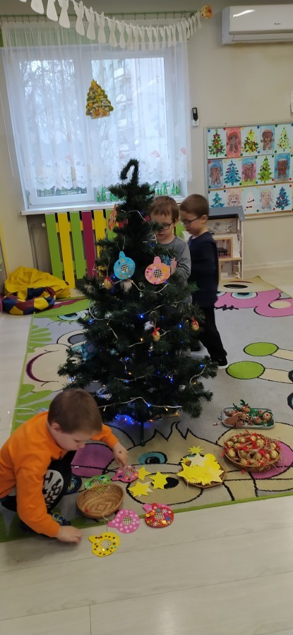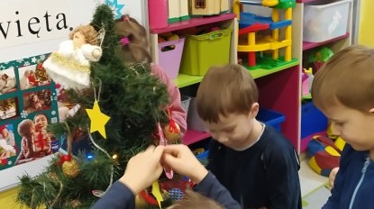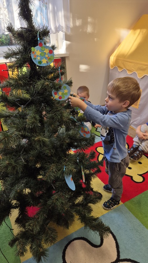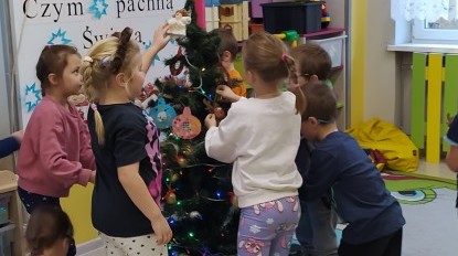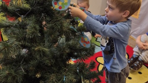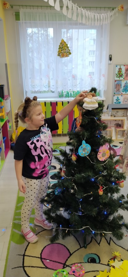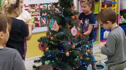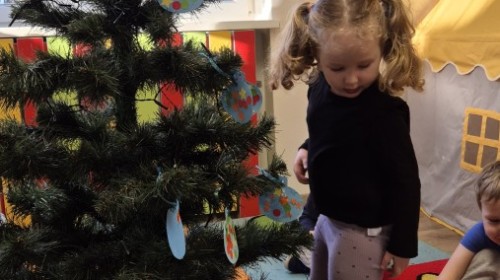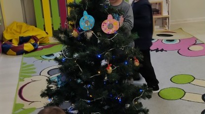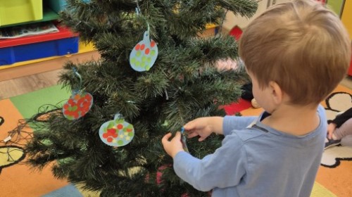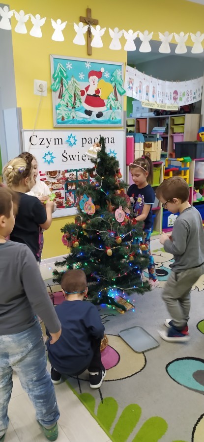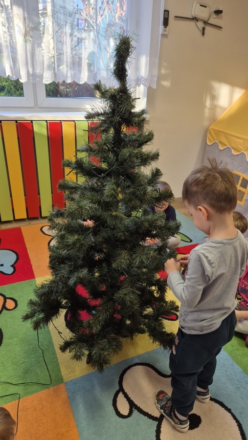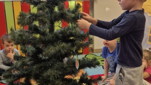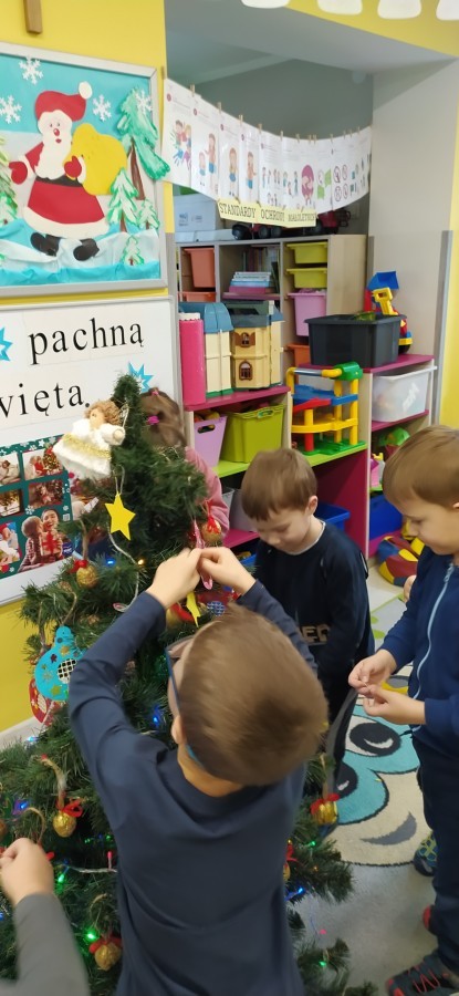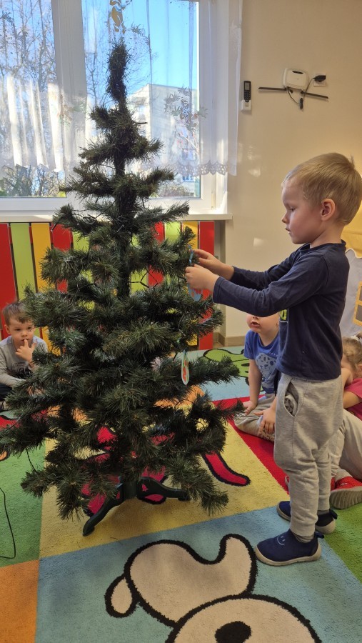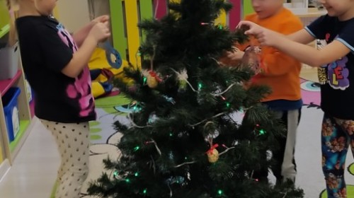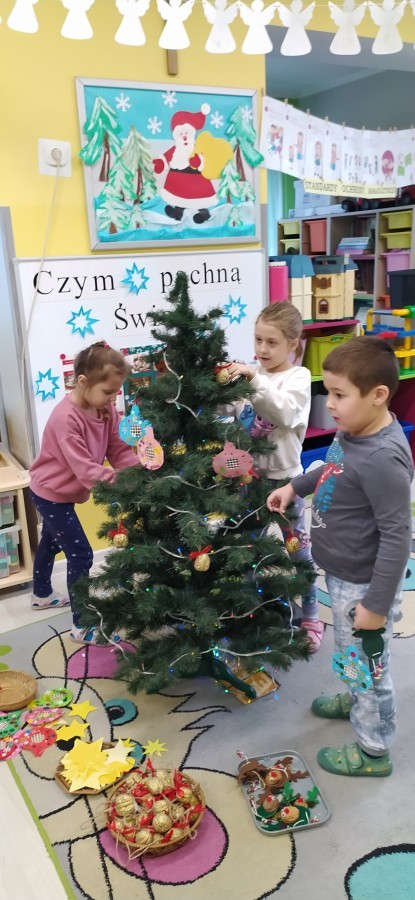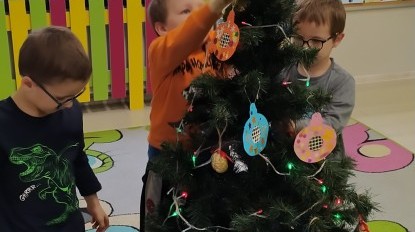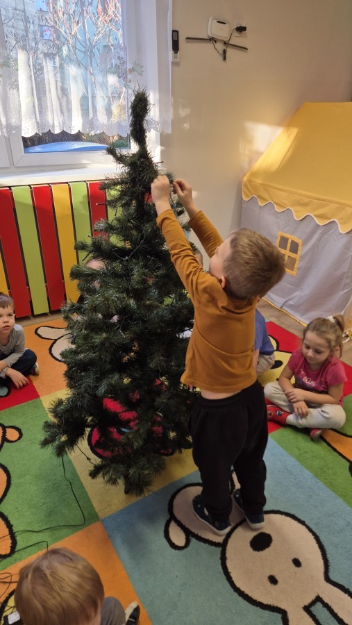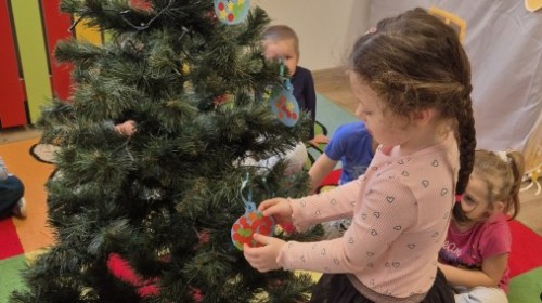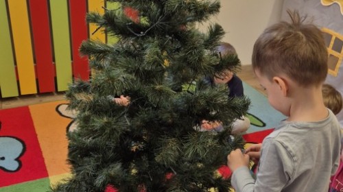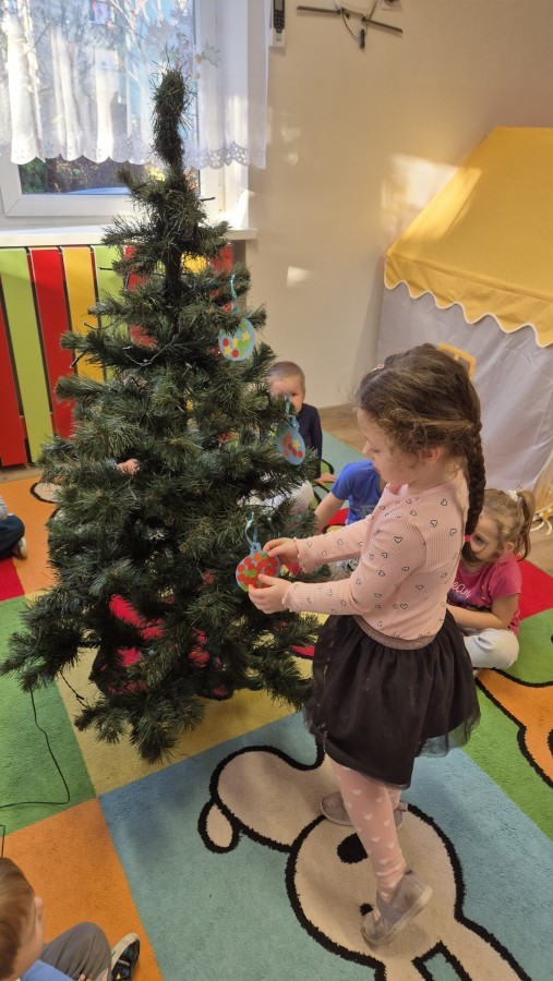 Zaczęliśmy od tego, co dzieci lubią najbardziej - strojenie choinek. Z wielkim zaangażowanie przedszkolaki zawieszały kolorowe bombki wykonane własnoręcznie. Obie choinki pięknie się prezentują w salach.