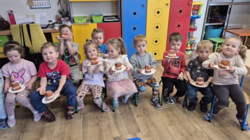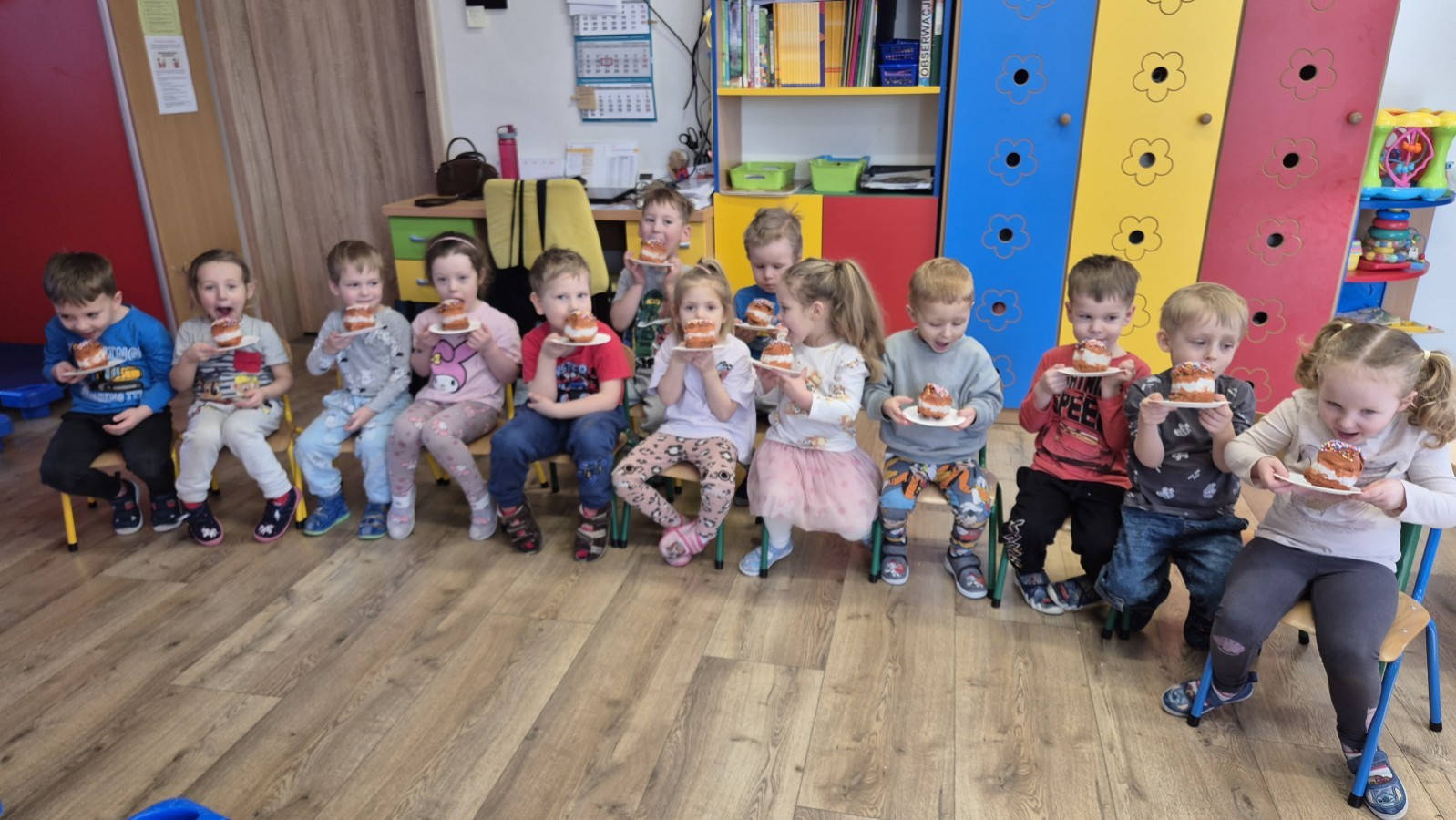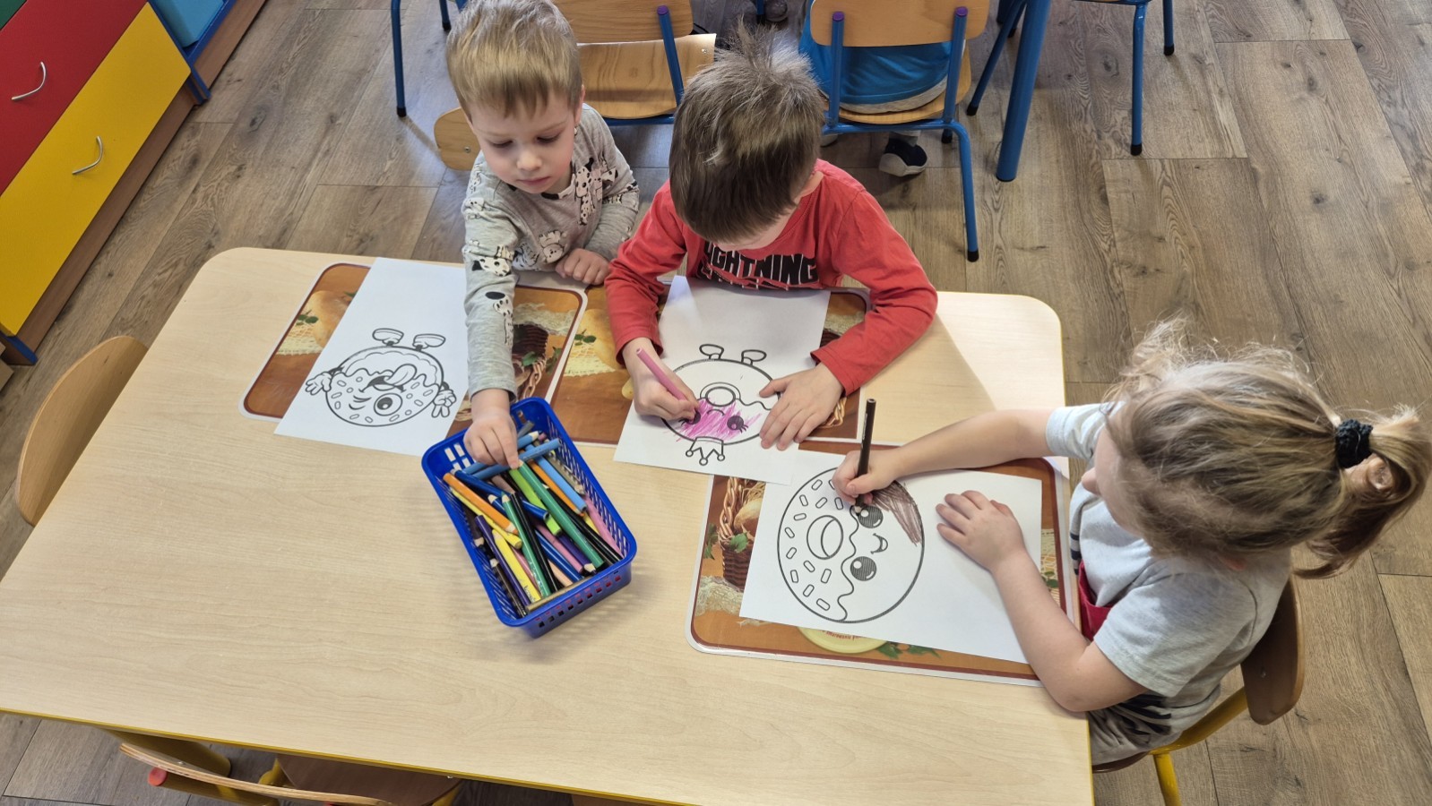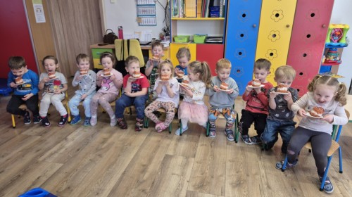 Tego dnia rozmawialiśmy o tradycjach związanych z tym pysznym świętem, a dzieci z ogromnym zaangażowaniem wykonały pracę plastyczną – kolorowe, papierowe pączki ozdobione „lukrem” i posypką.